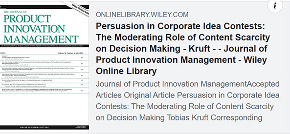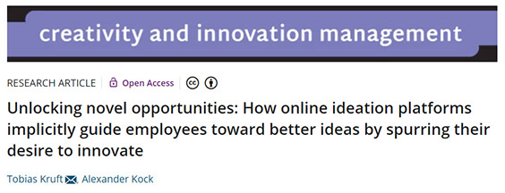 "The runner-up (very, very close!) goes to Tobias Kruft and Alexander Kock for their paper "Unlocking novel opportunities: How online ideation platforms implicitly guide employees toward better ideas by spurring their desire to innovate”. Here, the jury praises the authors for the excellent methodology and empirical approach, using two studies  with multilevel-, respectively ordinary least squares regression analyses, and a careful use of several models to test and study the effects of several control variables, independent variables and mediator variables. Furthermore, the study strongly contributes to theory and practice of creativity and online platforms. The authors derive three clear, practical suggestions from their study for companies and managers who want to stimulate innovative behavior of employees."
